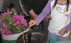 散華は、行道をやめ、誕生仏前で行いました。次に、「献華と灌沐をこのように行います・・・」と、「右まわりに花を受け取って、献華、次に誕生仏に3回甘茶をかけて、手を合わせます・・・」と、やってみせました。そして全員の木魚念仏の中、献華と灌沐を行い、全員がすむのを待って、差定に戻りました。
